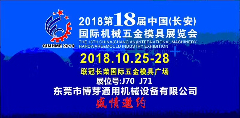展會(huì)名稱:第18屆中國(guó)(長(zhǎng)安)國(guó)際機(jī)械五金模具展覽會(huì)時(shí)間:2018年10月25-28日地點(diǎn):廣東省東莞市主辦方:廣東亞聯(lián)展覽股份有限公司展會(huì)地址:聯(lián)冠長(zhǎng)榮國(guó)際五金模具廣場(chǎng)備注:18年J70J71...